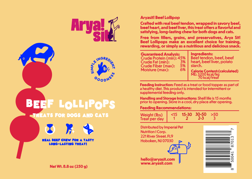 Arya Sit! natural beef lollipop chew are made with real beef tendon wrapped with real beef, beef heart, and liver. Contains no artificial flavors, sweeteners, grains, or preservatives. Our beef lollipop is high in protein and provides long-lasting chewing action that your dog will love!