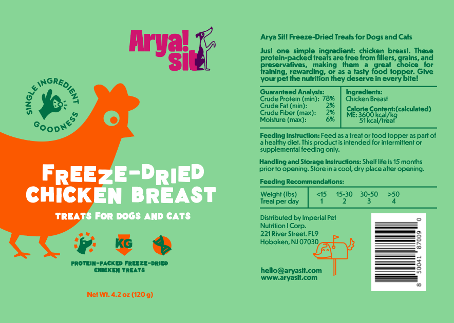 It almost can't get any healthier than chicken breast. Arya Sit! all-natural freeze-dried treats for dogs and cats are made with a single ingredient - real chicken breast! Perfect for pets with sensitive stomachs or those who are watching their weight. Contains no artificial flavors, sweeteners, grains, or preservatives, you can feel confident knowing that your pet is getting a healthy, nutritious snack.