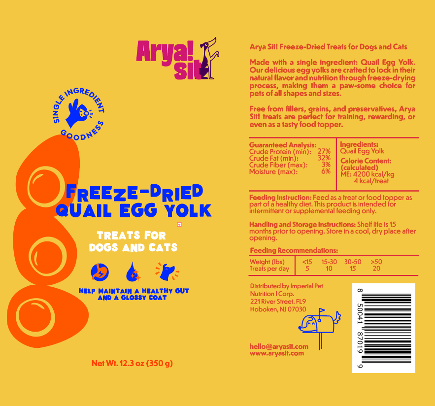Arya Sit! all-natural freeze-dried treat for dogs and cats is made with a single ingredient: Quail Egg Yolk! Our freeze-dried egg yolk is rich in lecithin, which supports a healthy and shiny coat. Contains no artificial flavors, sweeteners, grains or preservatives, you can feel confident knowing that your pet is getting a healthy, nutritious snack.